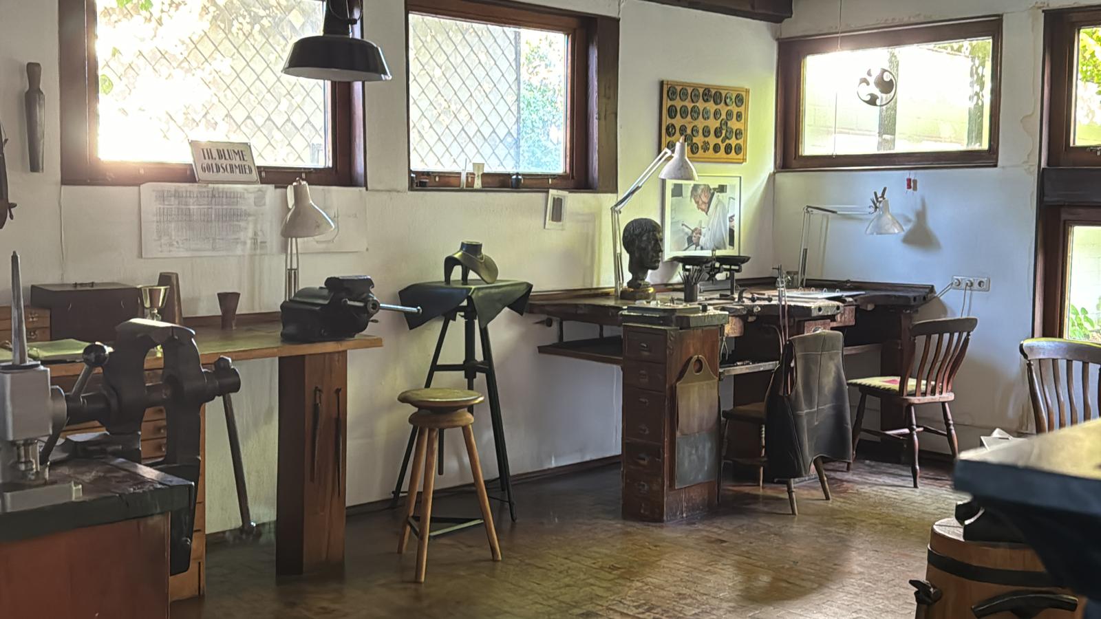 Die Führung begann in der historischen Werkstatt, wo Jochen Blume mit lebendigen Anekdoten und fundiertem Wissen die faszinierende Geschichte seines Berufsstandes zum Leben erweckte. „Die Kunst des Goldschmiedens ist so alt wie die Zivilisation selbst“, erklärte er, während die Gäste die feinen Werkzeuge und Rohmaterialien bestaunten, die in der Werkstatt ihren Platz gefunden hatten.